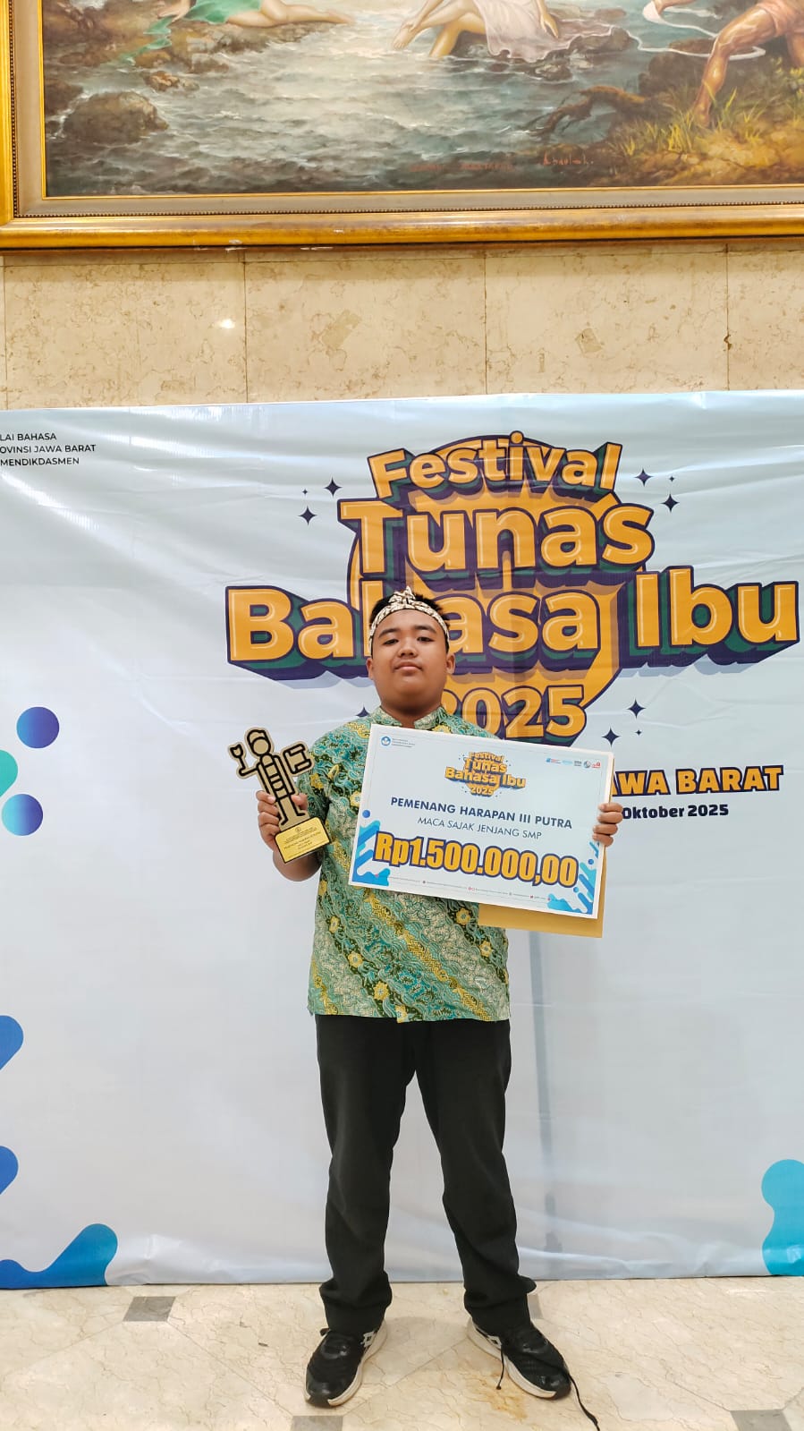 Salah satu siswa terbaik, M. Rizky Al Husni dari kelas 9B, berhasil meraih Pemenang Harapan III Maca Sajak Putra dalam ajang Festival Tunas Bahasa Ibu (FTBI) 2025 Tingkat Provinsi Jawa Barat.